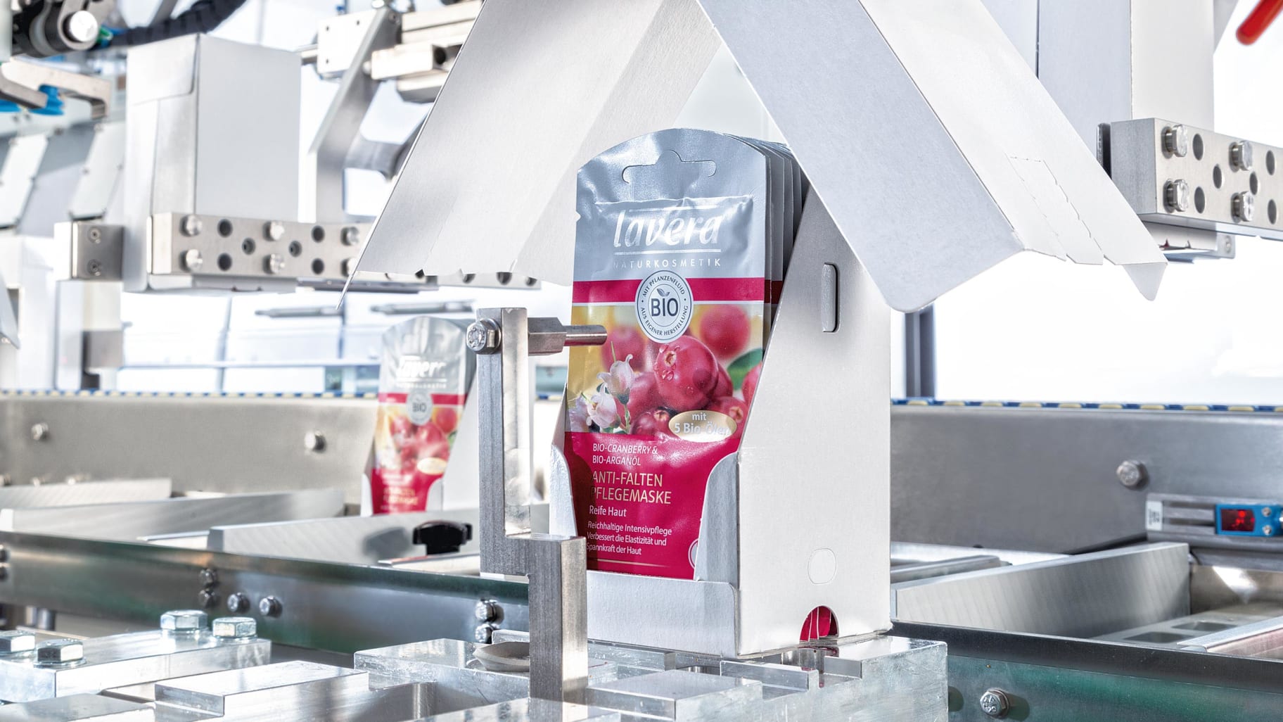 Natural cosmetics manufacturer Laverana provides a wide range of cosmetics, including lip balm sticks in cardboard blisters and face masks in sachets. The company needed an automation solution which could pack both products in different packaging formats, but on the same system. Schubert-Cosmetics developed a solution which was customised exactly to these requirements.