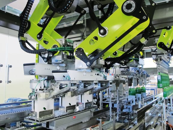 The smaller 50 ml bottles are grouped upright into the plastic trays and fitted with a top tray. The complete grouping is then transferred into the carton together with the top and bottom trays. This effectively protects the products from damage. The 750 ml bottles are packed horizontally into the cartons by the robots. Special plastic trays, which are positioned in the carton from below and above, ensure product protection.