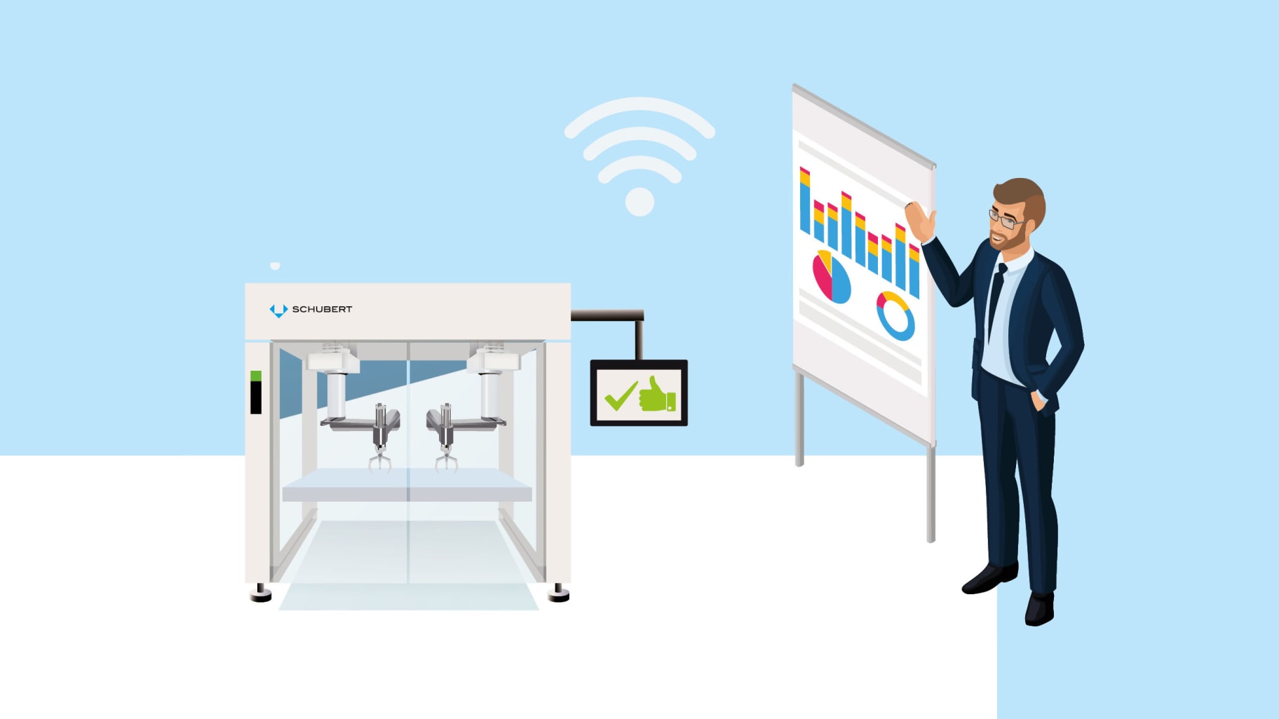 Si une machine d’emballage n’apporte pas au client la cadence attendue, il s’agit d’en rechercher les causes. Dans une grande installation de haute technologie, cela n’est toutefois pas si simple, car l’interaction entre les différents composants de la machine n’est pas un processus linéaire, mais plutôt une communication en réseau. Mais entre-temps, les données machine fournies par la passerelle industrielle GS.Gate à partir des machines Schubert sont si détaillées que le client lui-même ainsi que les experts du Service après-vente peuvent effectuer une analyse de données très poussée sur le portail client avec les services numériques CARE IIoT READY et CARE ANALYTICAL.